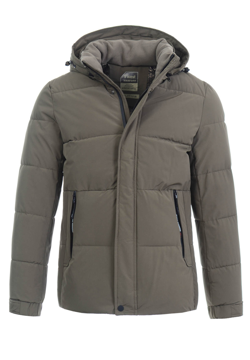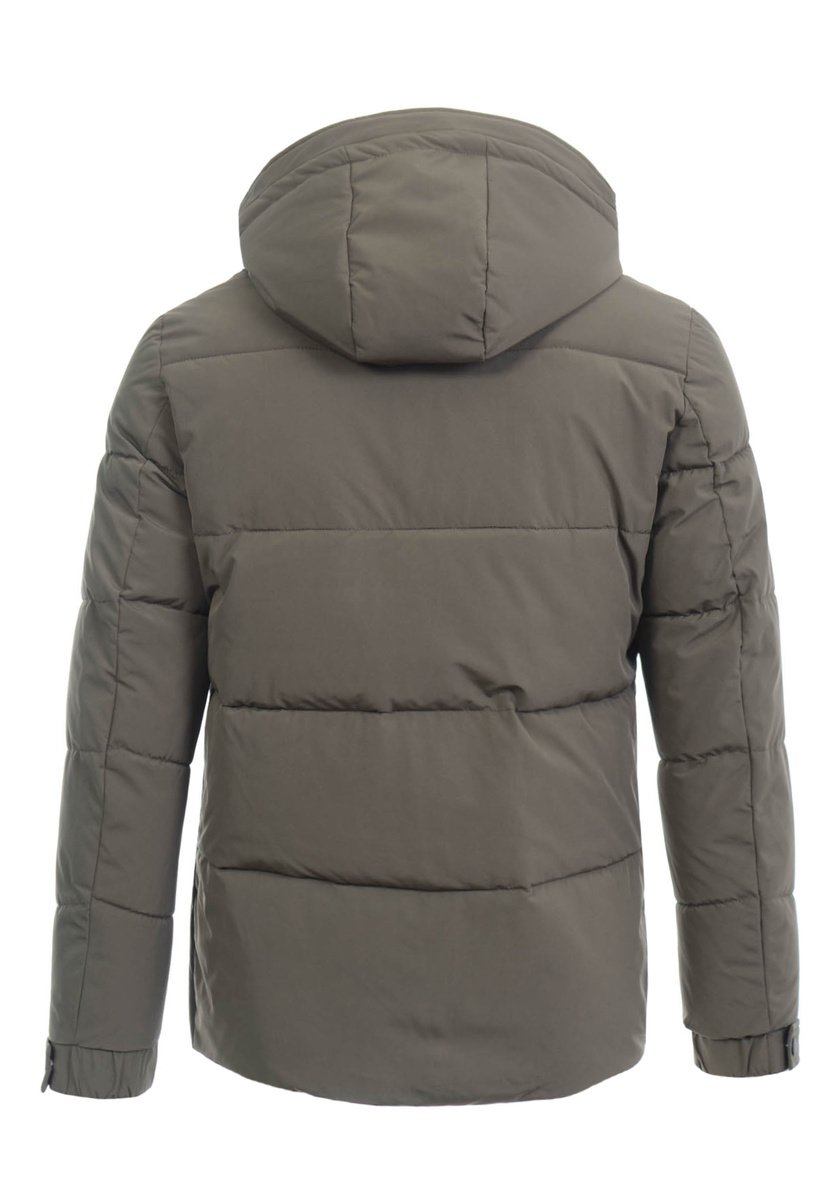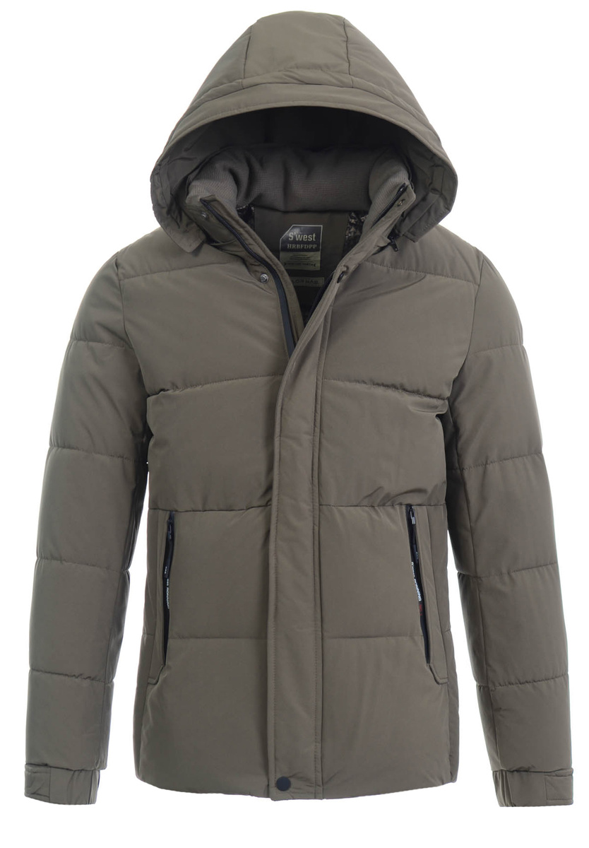 Męska zimowa kurtka khaki. Zapinana na suwak i napy. Kurtka posiada dwie kieszenie na dole zapinane na suwak. Odpinany kaptur ze ściągaczem zapewnia ciepło w zimowe, wietrze dni. Kurtka wykonana jest z materiałów najwyższej jakości. Kurtka ocieplona jest bardzo wysokiej jakości wypełnieniem syntetycznym, które zapewnia doskonałą termoizolację oraz wysoki komfort użytkowania. Mankiety zapinane na napę.