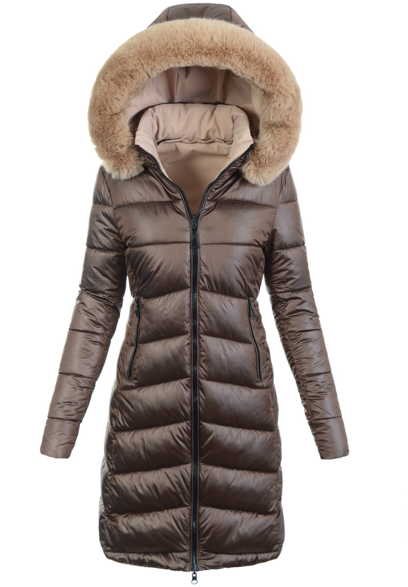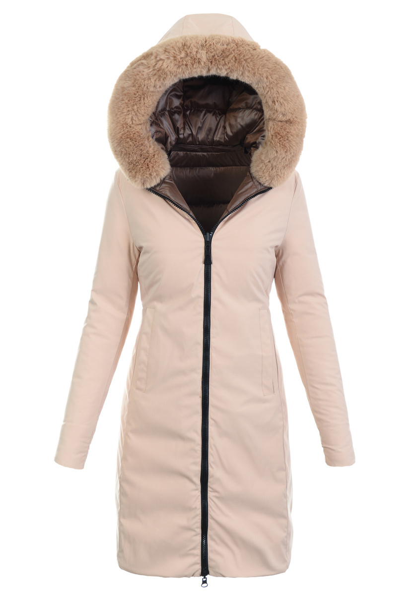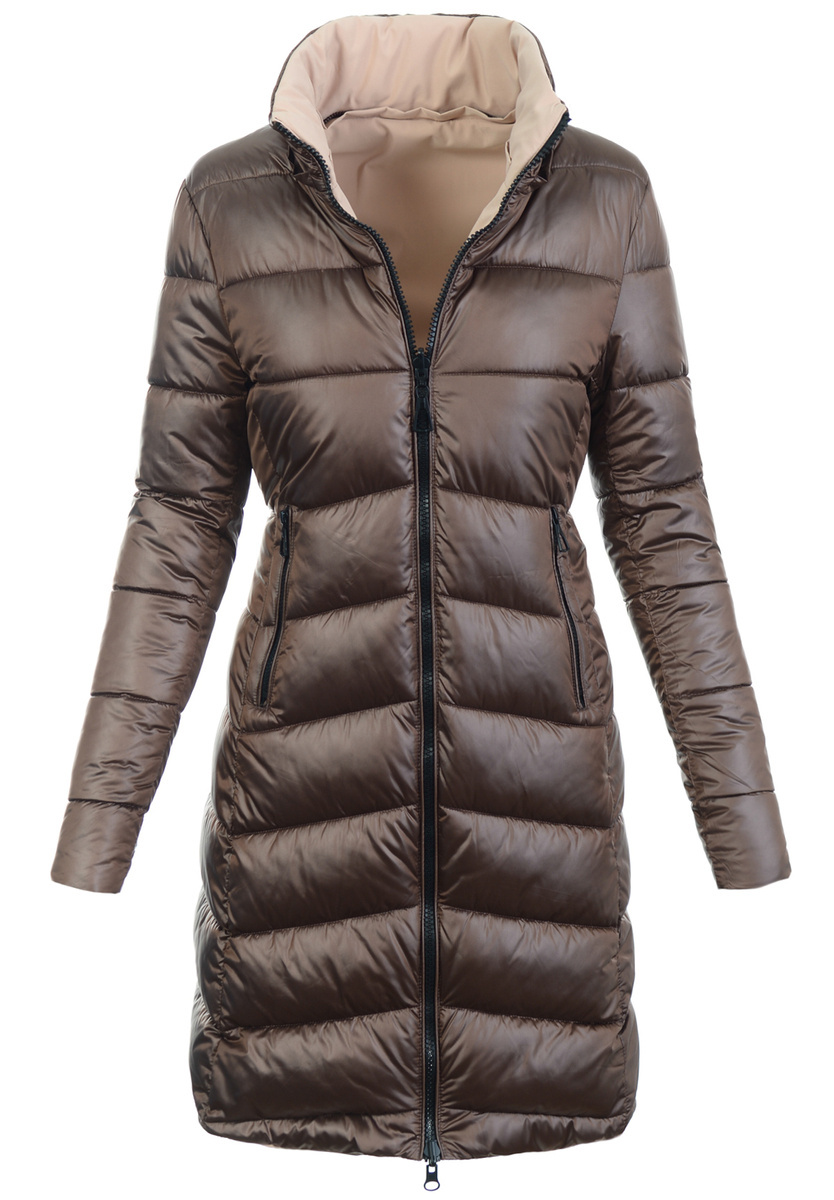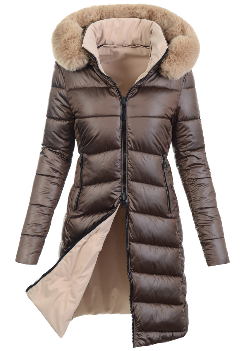 Zdecydowany hit tego sezonu, dwustronna kurtka damska. Kurtka w kolorze brązowym druga strona kurtki w kolorze beżowym. Kurtka zapinana jest na praktyczny, solidny podwójny suwak. Wysokiej jakości wypełnienie syntetyczne jest równomiernie rozprowadzone po kurtce, również w rękawach i zapewnia ochronę w mroźne, zimowe dni. Kurtka wykończona jest podszewką. Kurtka posiada odpinany kaptur z odpinanym futerkiem. Dodatkowo posiada ona dwie duże zapinane na suwak kieszenie. Wykonana jest z materiałów najwyższej jakości. Idealnie sprawdzi się zarówno przy eleganckich jak i sportowych zimowych stylizacjach.