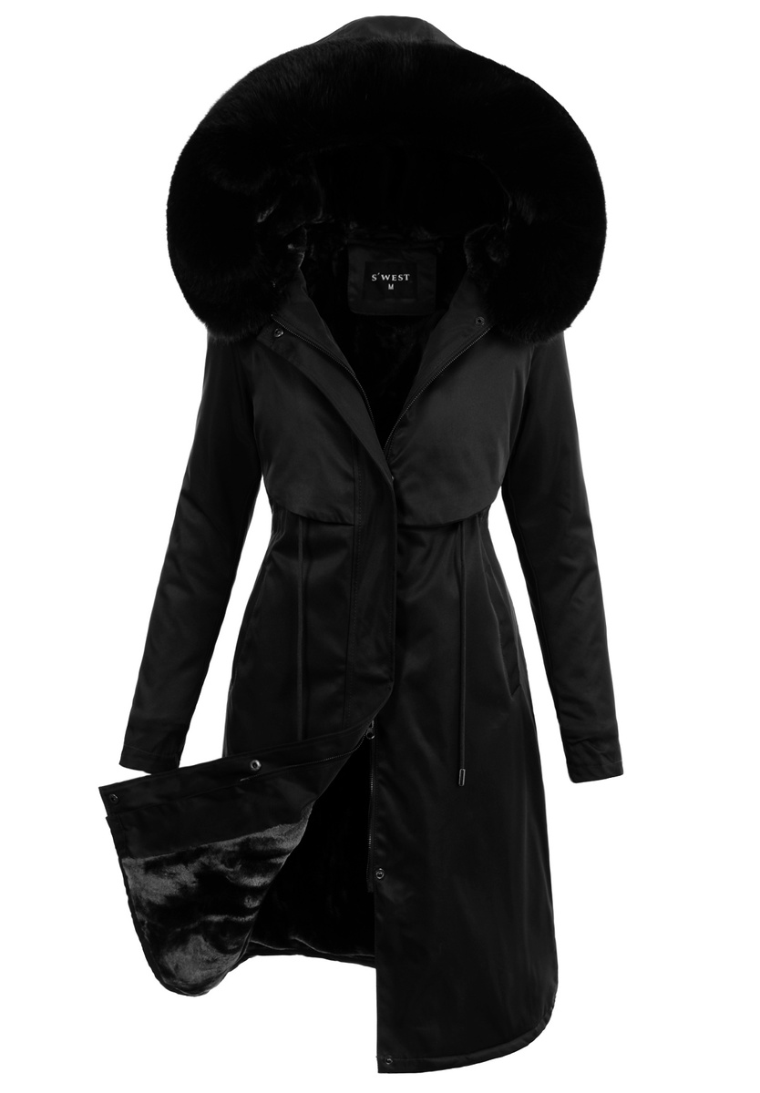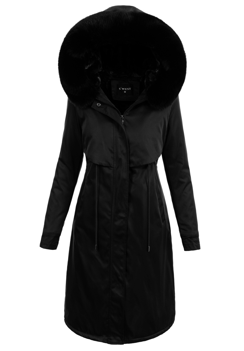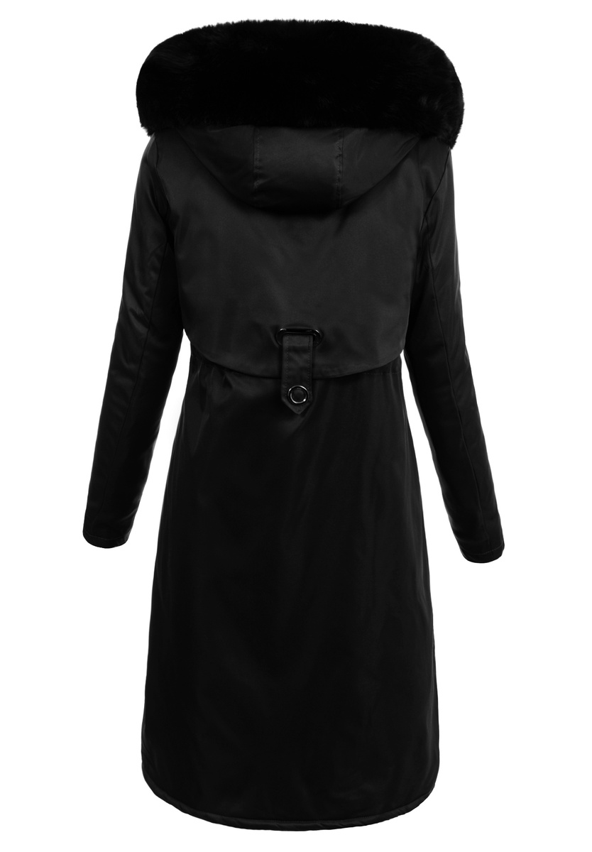 Bardzo elegancka, kurtka parka zimowa w kolorze czarnym. Wspaniała długa parka jest idealnym rozwiązaniem dla Kobiet, które cenią sobie nowoczesność oraz elegancją. Kurtka posiada dwie praktyczne zapinane na zatrzaski kieszenie oraz nieodpinany kaptur, który zapewnia ochronę przed wiatrem i chłodem w mroźne zimowe dni. Futerko przy kapturze jest odpinane. Odzież wykonana z wysokiej klasy materiałów, wykończona aksamitnym futerkiem, niezmiernie przyjemny w dotyku. Całość uzupełniają ściągacze pozwalające, na perfekcyjne dopasowanie kurtki do sylwetki. Parka zapinana jest na napy oraz podwójny suwak.