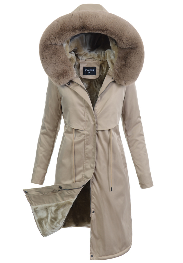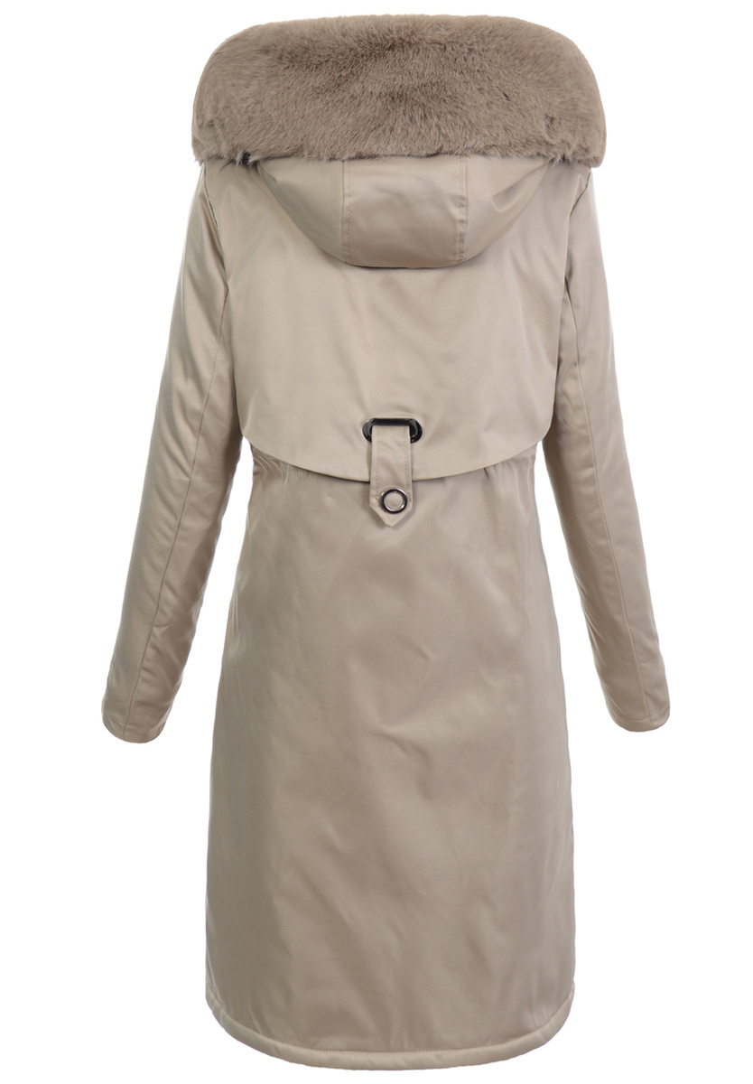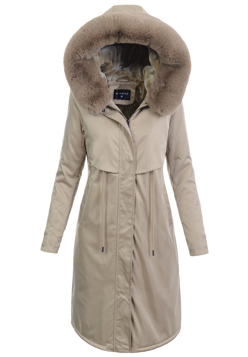 Bardzo elegancka, kurtka parka zimowa w kolorze beżowym. Wspaniała długa parka jest idealnym rozwiązaniem dla Kobiet, które cenią sobie nowoczesność oraz elegancją. Kurtka posiada dwie praktyczne zapinane na zatrzaski kieszenie oraz nieodpinany kaptur, który zapewnia ochronę przed wiatrem i chłodem w mroźne zimowe dni. Futerko przy kapturze jest odpinane. Odzież wykonana z wysokiej klasy materiałów, wykończona aksamitnym futerkiem, niezmiernie przyjemny w dotyku. Całość uzupełniają ściągacze pozwalające, na perfekcyjne dopasowanie kurtki do sylwetki. Parka zapinana jest na napy oraz podwójny suwak.