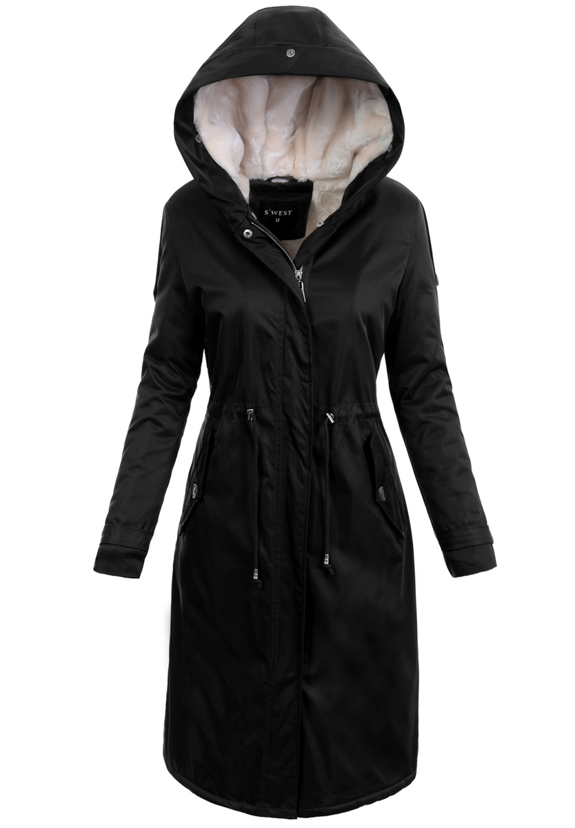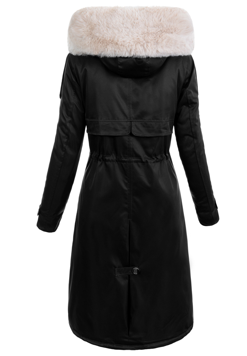 Bardzo elegancka, kurtka parka zimowa w kolorze czarnym. Futerko w kolorze ecru. Wspaniała długa parka jest idealnym rozwiązaniem dla Kobiet, które cenią sobie nowoczesność oraz elegancją. Kurtka posiada dwie praktyczne zapinane na guziki kieszenie oraz nieodpinany kaptur, który zapewnia ochronę przed wiatrem i chłodem w mroźne zimowe dni. Futerko przy kapturze oraz wzdłuż suwaka jest odpinane. Odzież wykonana z wysokiej klasy materiałów, wykończona aksamitnym futerkiem, niezmiernie przyjemny w dotyku. Całość uzupełniają ściągacze pozwalające, na perfekcyjne dopasowanie kurtki do sylwetki. Parka zapinana jest na napy oraz podwójny suwak.