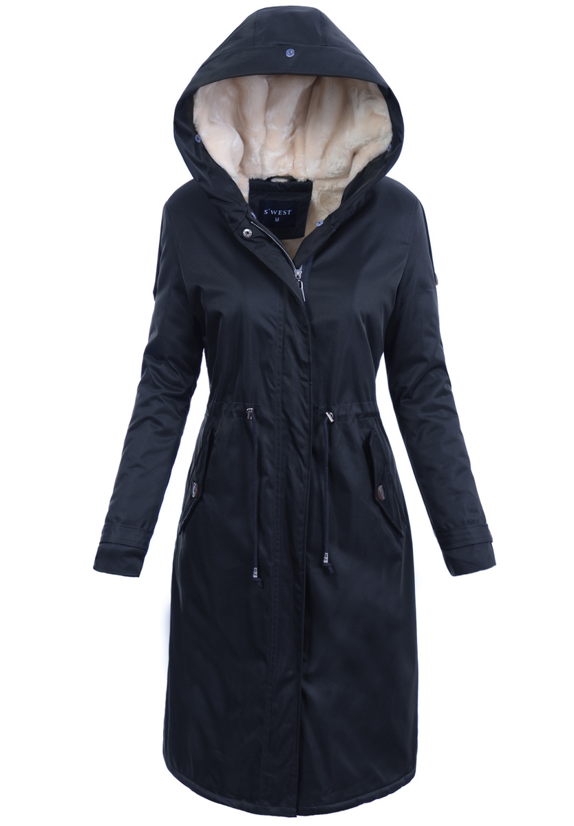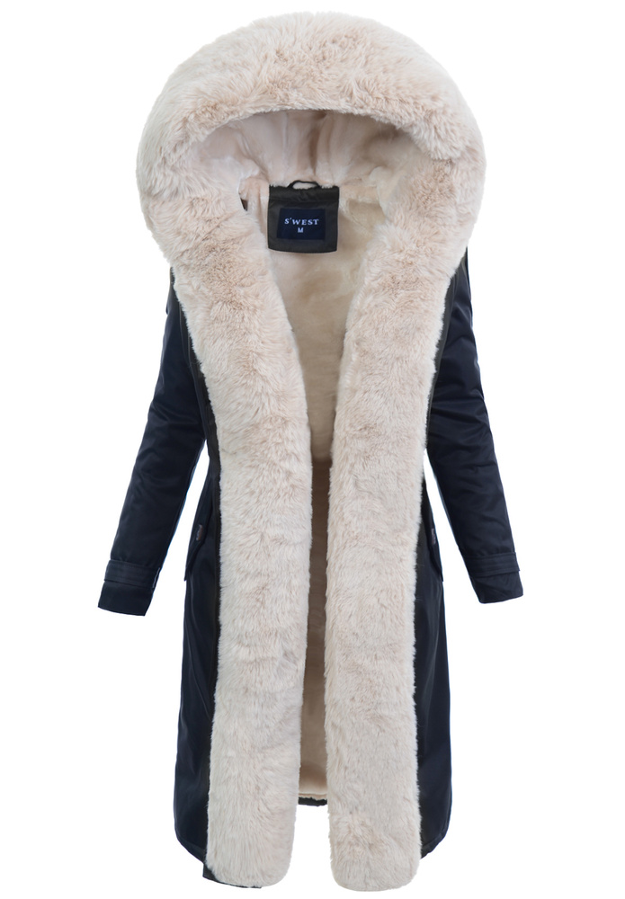 Bardzo elegancka, kurtka parka zimowa w kolorze granatowym. Futerko w kolorze ecru. Wspaniała długa parka jest idealnym rozwiązaniem dla Kobiet, które cenią sobie nowoczesność oraz elegancją. Kurtka posiada dwie praktyczne zapinane na guziki kieszenie oraz nieodpinany kaptur, który zapewnia ochronę przed wiatrem i chłodem w mroźne zimowe dni. Futerko przy kapturze oraz wzdłuż suwaka jest odpinane. Odzież wykonana z wysokiej klasy materiałów, wykończona aksamitnym futerkiem, niezmiernie przyjemny w dotyku. Całość uzupełniają ściągacze pozwalające, na perfekcyjne dopasowanie kurtki do sylwetki. Parka zapinana jest na napy oraz podwójny suwak.