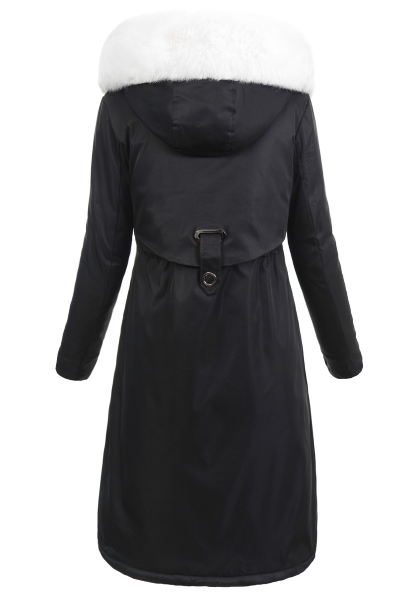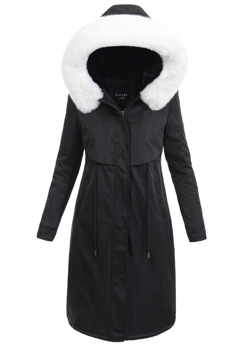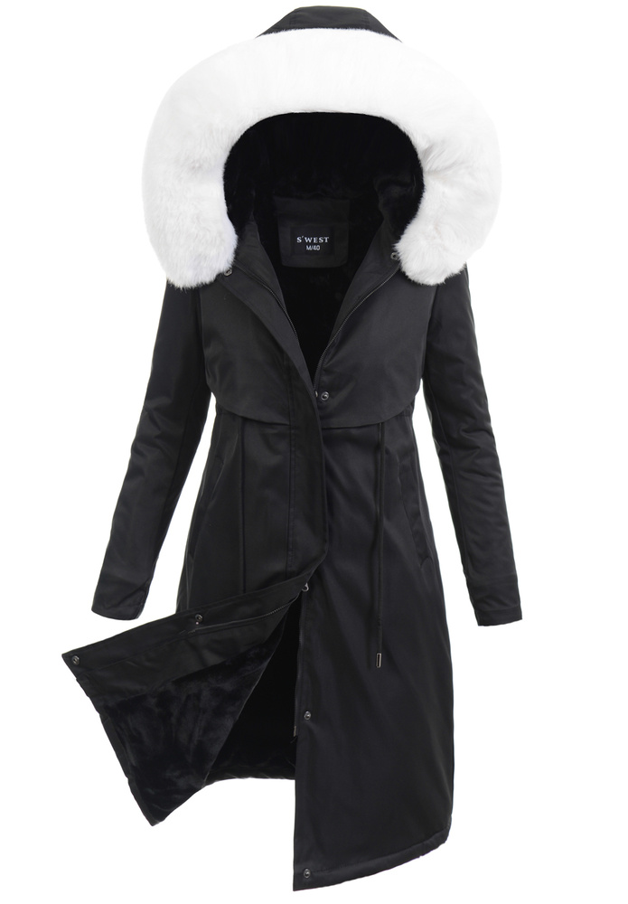 Bardzo elegancka, kurtka parka zimowa w kolorze czarnym z białym futerkiem. Wspaniała długa parka jest idealnym rozwiązaniem dla Kobiet, które cenią sobie nowoczesność oraz elegancją. Kurtka posiada dwie praktyczne zapinane na zatrzaski kieszenie oraz nieodpinany kaptur, który zapewnia ochronę przed wiatrem i chłodem w mroźne zimowe dni. Futerko przy kapturze jest odpinane. Odzież wykonana z wysokiej klasy materiałów, wykończona aksamitnym futerkiem, niezmiernie przyjemny w dotyku. Całość uzupełniają ściągacze pozwalające, na perfekcyjne dopasowanie kurtki do sylwetki. Parka zapinana jest na napy oraz podwójny suwak.