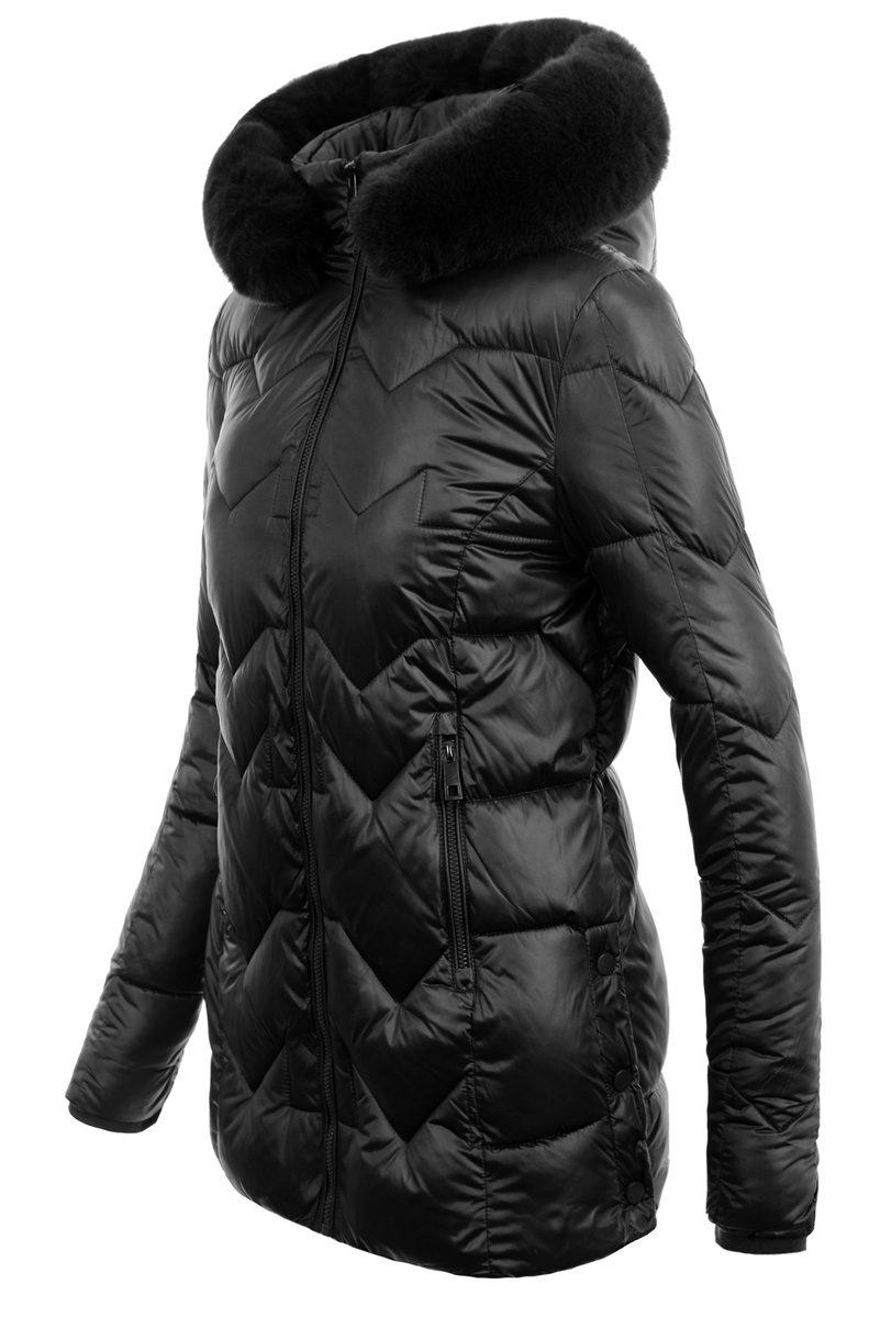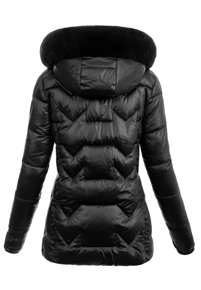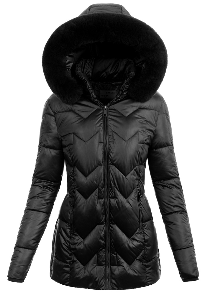 Przepiękna damska zimowa, pikowana kurtka w kolorze czarnym. Kurtka zapinana jest na suwak. Ocieplona wysokiej jakości wypełnieniem syntetycznym, która zapewnia termoizolację i wysoki komfort użytkowania. Posiada dwie pojemne, zapinane na suwak kieszenie. Kurtka posiada odpinany kaptur z odpinanym futerkiem, który idealnie sprawdzi się jako ochrona przed wiatrem i deszczem. Kurteczka jest idealnym rozwiązaniem dla osób ceniących sobie wygodę idealna do wielu stylizacji. Dodatkowo w rękawach znajdują się materiałowe ściągacze.