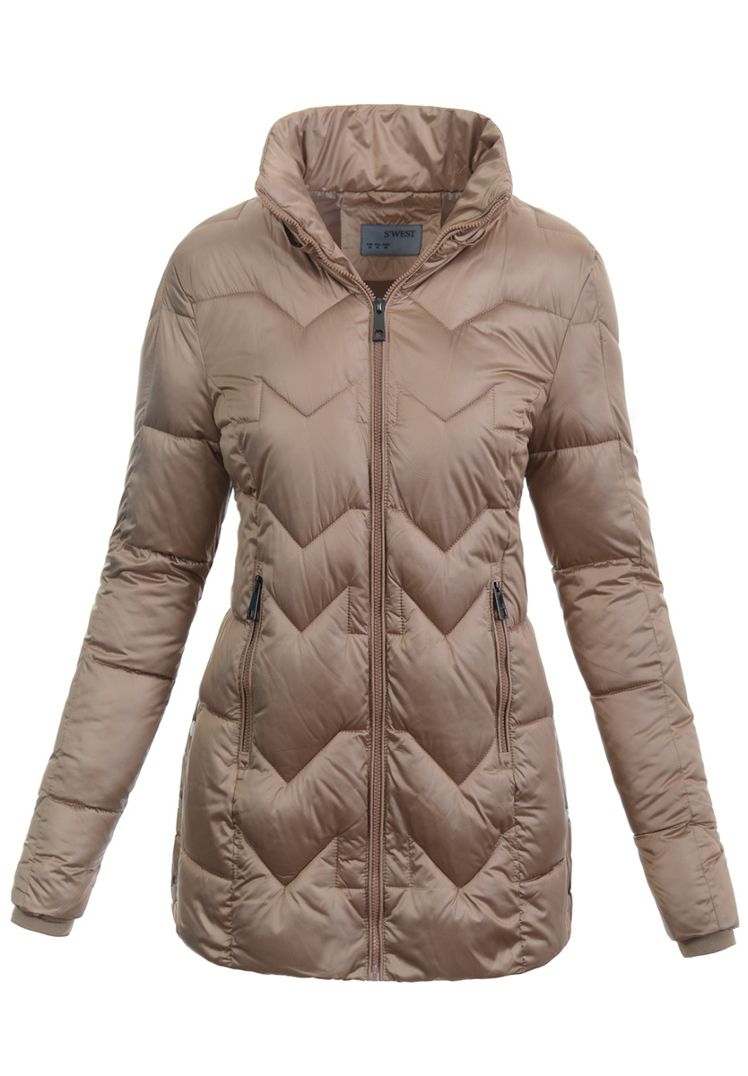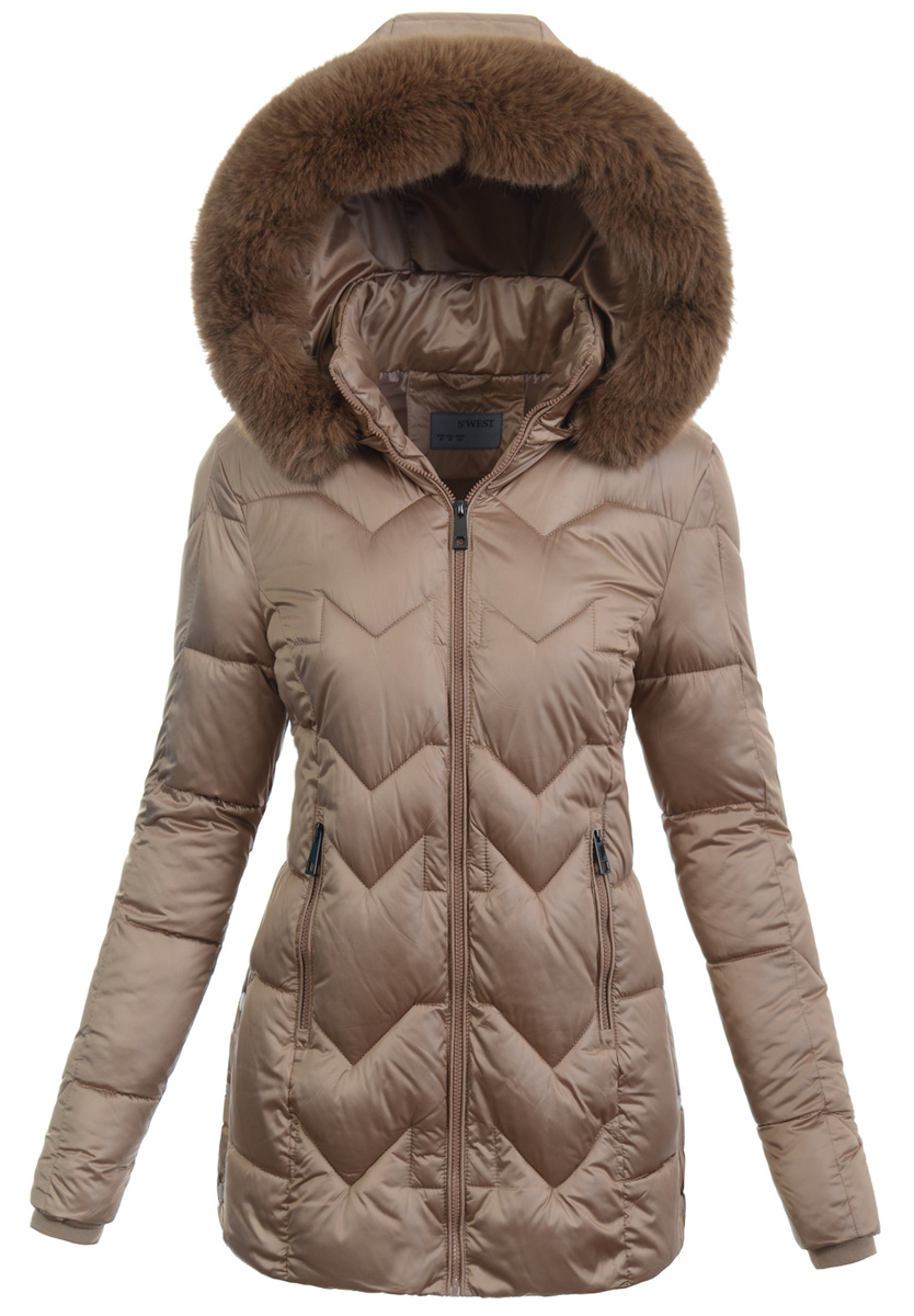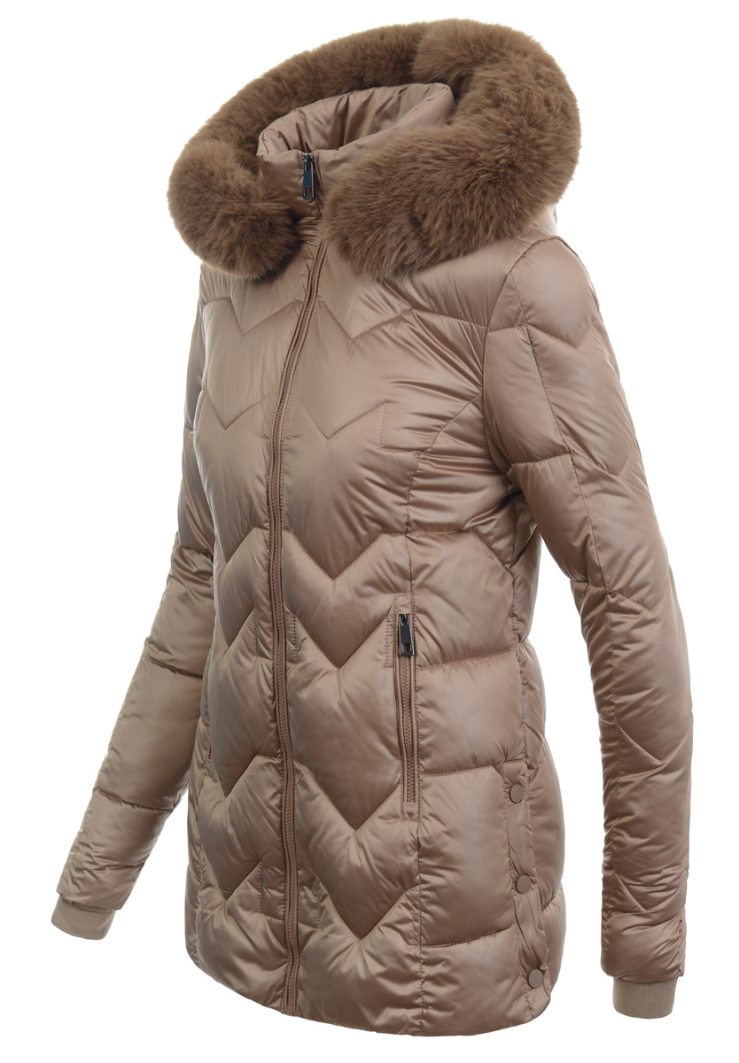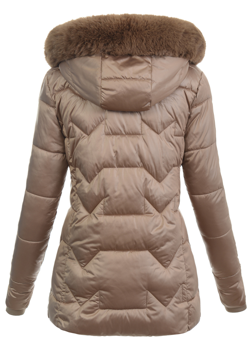 Przepiękna damska zimowa, pikowana kurtka w kolorze złotym. Kurtka zapinana jest na suwak. Ocieplona wysokiej jakości wypełnieniem syntetycznym, która zapewnia termoizolację i wysoki komfort użytkowania. Posiada dwie pojemne, zapinane na suwak kieszenie. Kurtka posiada odpinany kaptur z odpinanym futerkiem, który idealnie sprawdzi się jako ochrona przed wiatrem i deszczem.  Kurteczka jest idealnym rozwiązaniem dla osób ceniących sobie wygodę idealna do wielu stylizacji. Dodatkowo w rękawach znajdują się materiałowe ściągacze.
