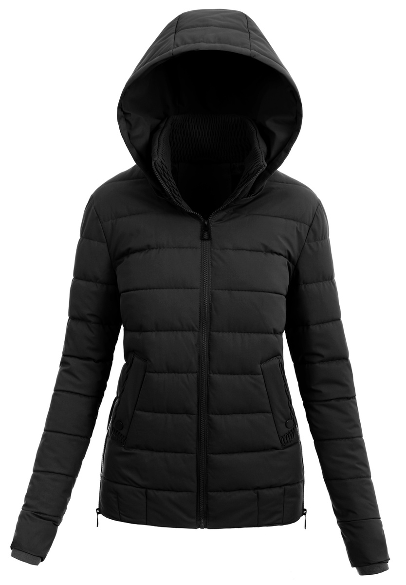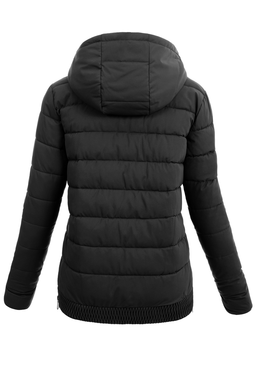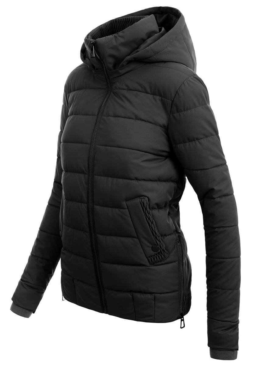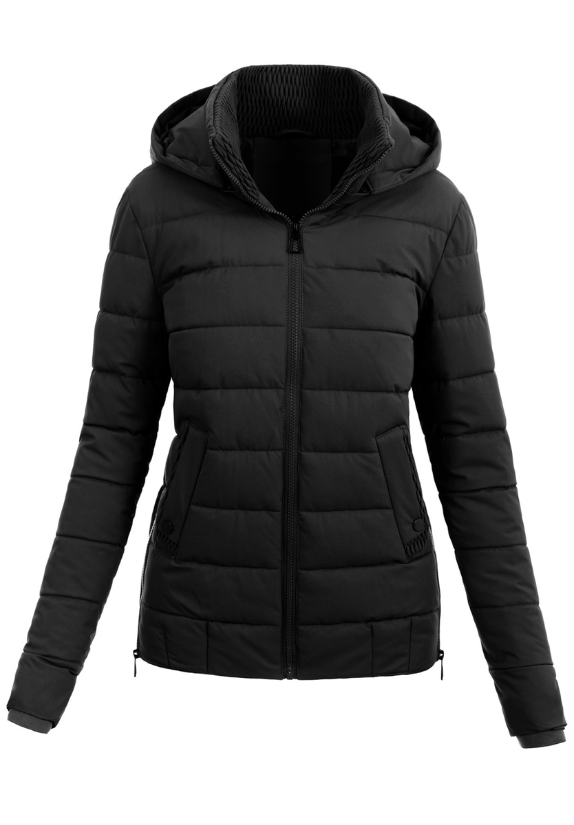 Przepiękna damska zimowa, pikowana kurtka w kolorze czarnym. Kurtka zapinana jest na suwak. Ocieplona wysokiej jakości wypełnieniem syntetycznym, która zapewnia termoizolację i wysoki komfort użytkowania. Posiada dwie pojemne kieszenie. Kurtka posiada odpinany kaptur, który idealnie sprawdzi się jako ochrona przed wiatrem i deszczem. Kurteczka jest idealnym rozwiązaniem dla osób ceniących sobie wygodę idealna do wielu stylizacji. Dodatkowo w rękawach znajdują się materiałowe ściągacze oraz suwaki po bokach kurtki.