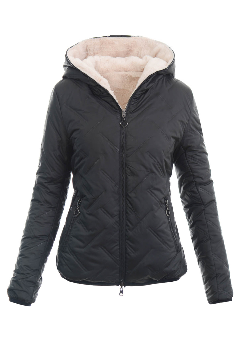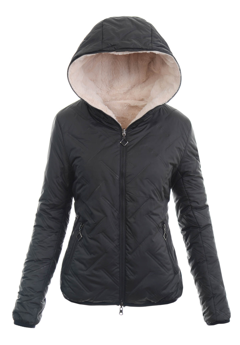 Przepiękna damska zimowa, pikowana, dwustronna kurtka w kolorze czarnym. Kurtka zapinana jest na podwójny suwak. Ocieplona wysokiej jakości futerkiem w kolorze beżowym, które zapewnia termoizolację i wysoki komfort użytkowania. Posiada dwie pojemne, zapinane na suwak kieszenie. Kurtka posiada nieodpinany kaptur, który idealnie sprawdzi się jako ochrona przed wiatrem i deszczem.  Kurteczka jest idealnym rozwiązaniem dla osób ceniących sobie wygodę idealna do wielu stylizacji. Możliwość noszenia kurtki futerkiem do góry.
